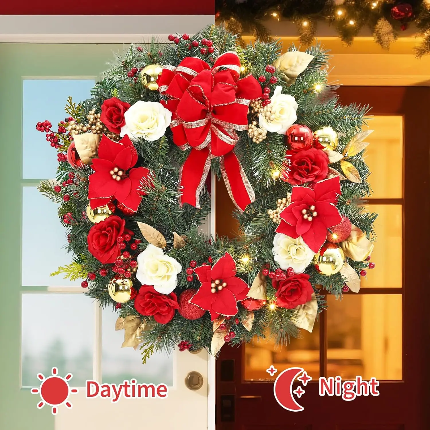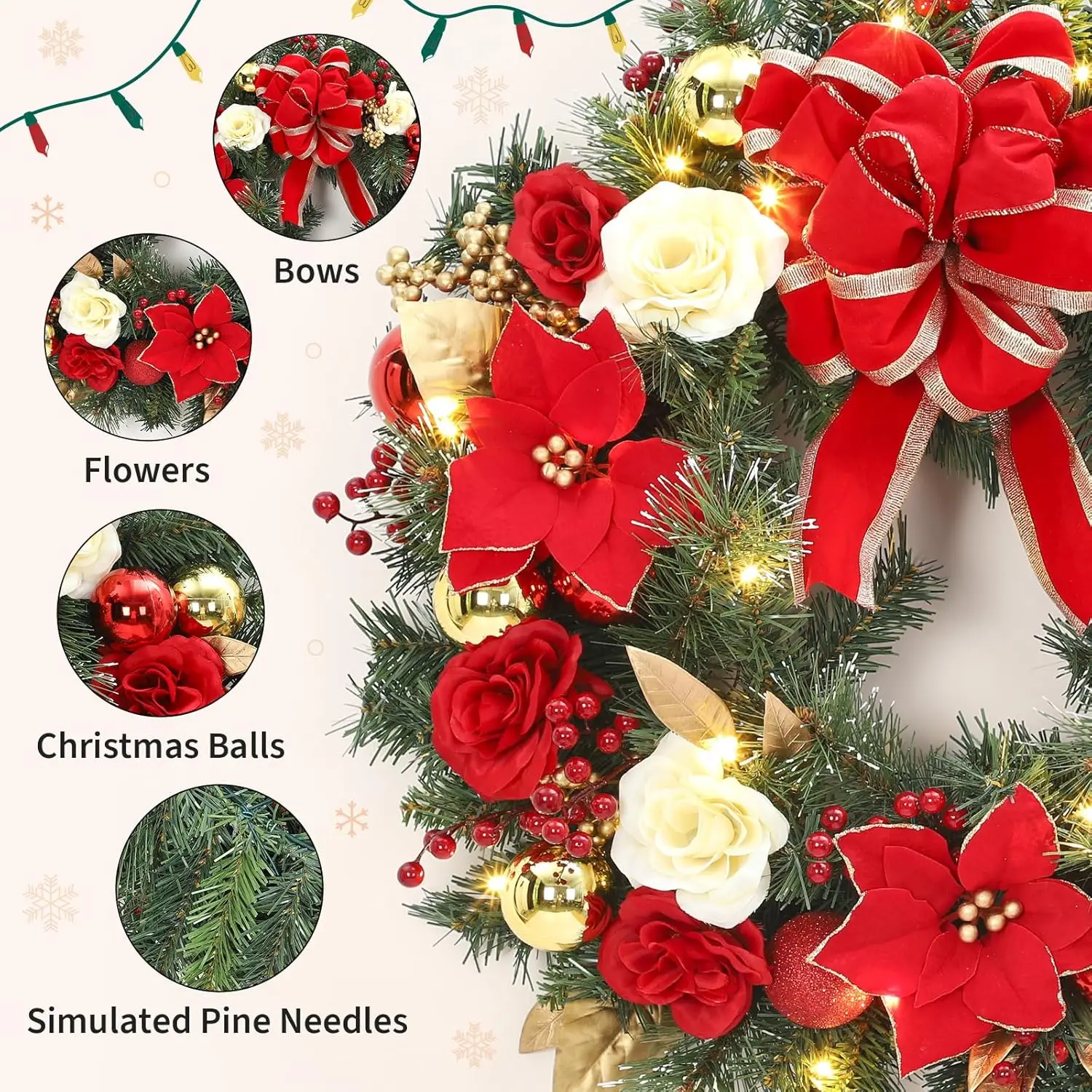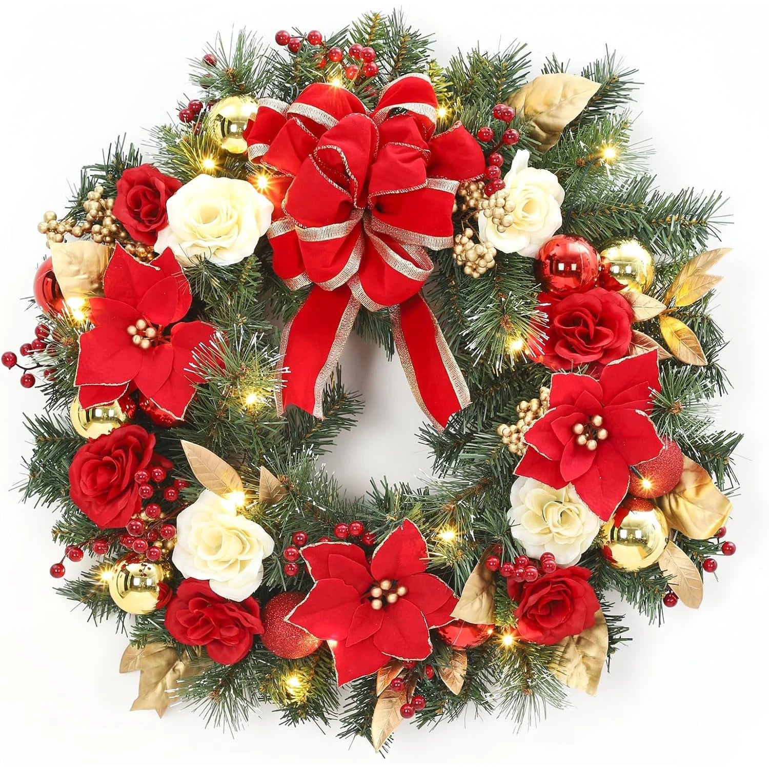 - Measuring 24 inches, this wreath showcases a classic red bow with artificial flowers and Xmas balls for a lush, welcoming look.