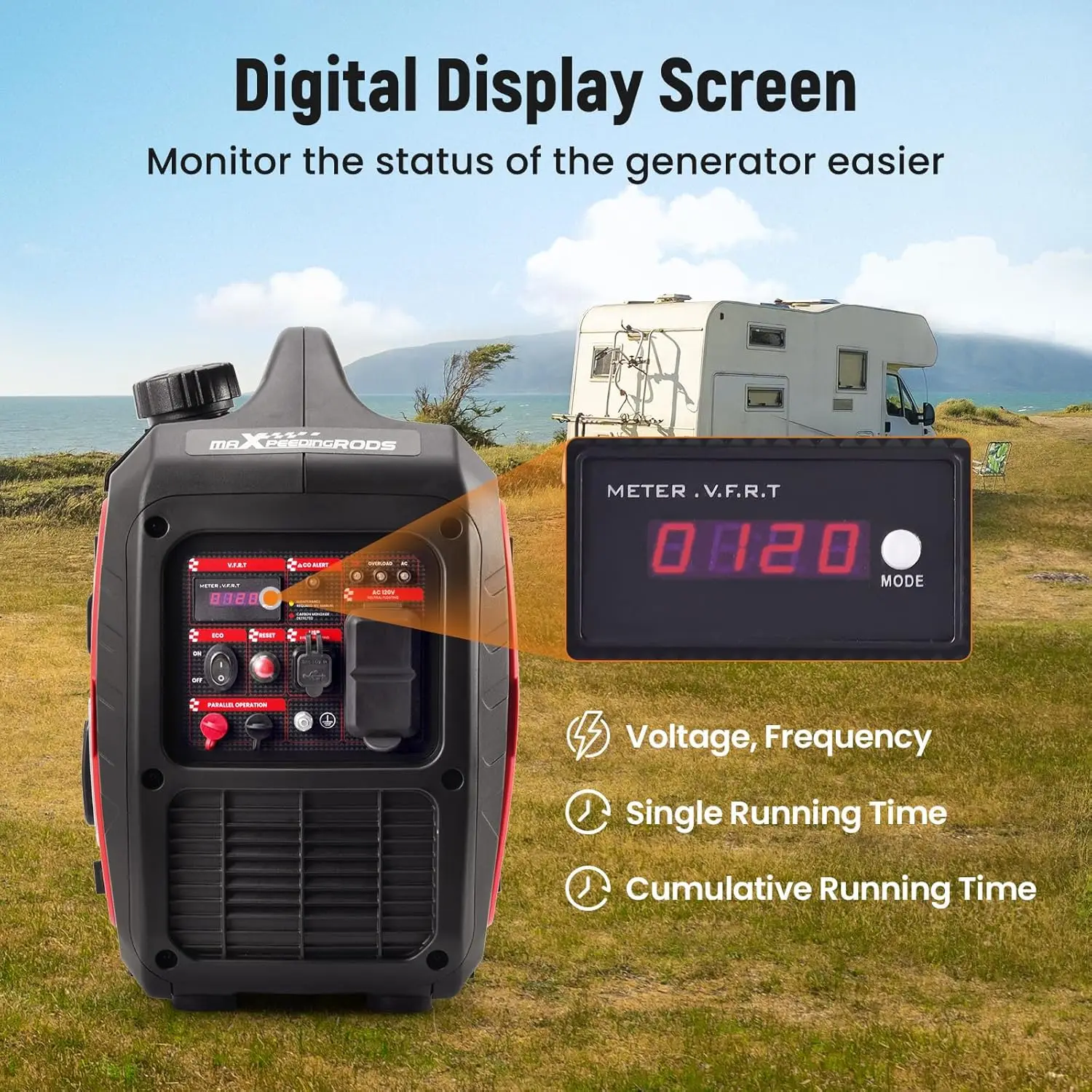 - You monitor performance at a glance with a digital display that shows voltage, frequency, run-time, and total runtime in real time.
