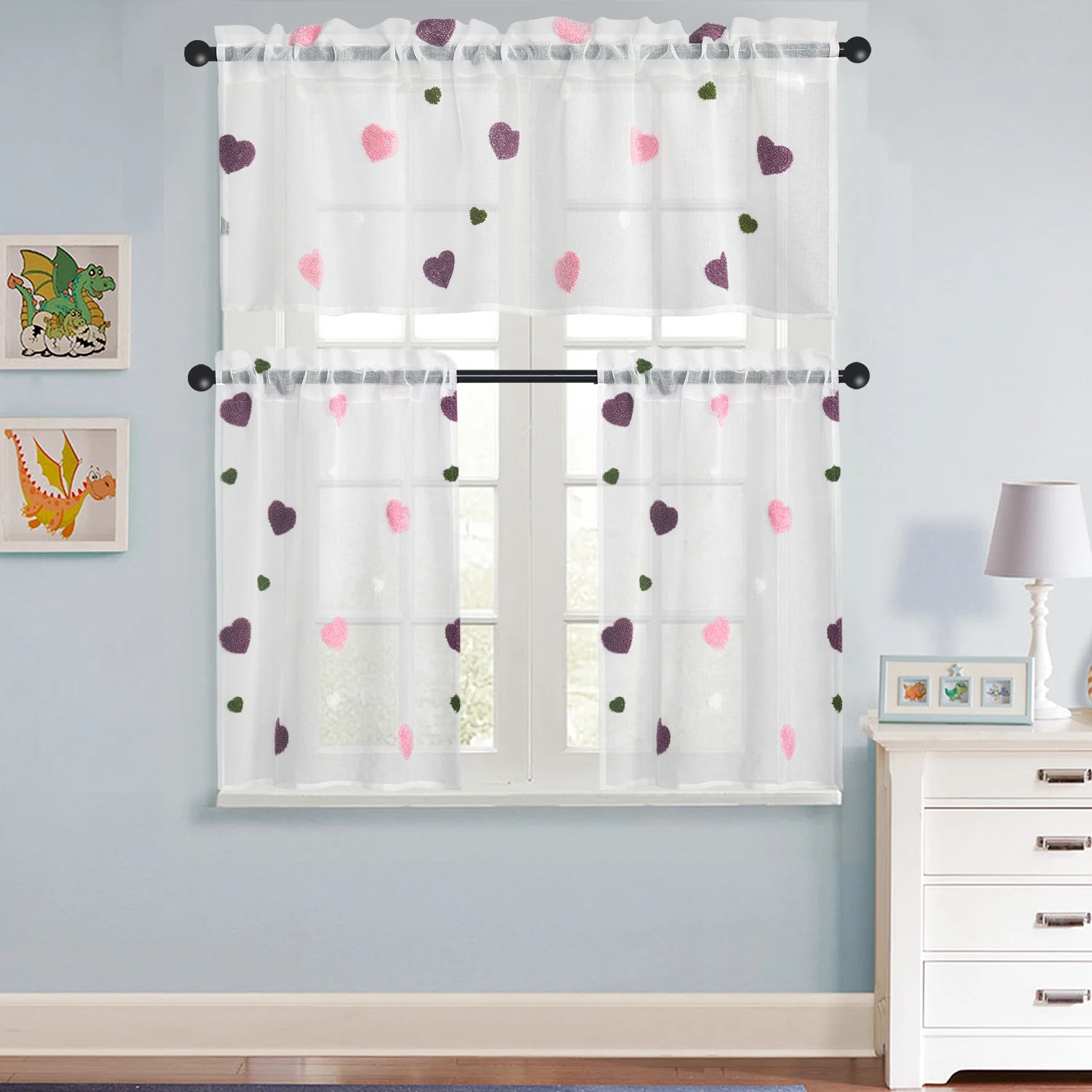 - Three-piece set includes a valance (52" W x 18" L) and two tiers (each 24" W x 36" L) for a complete, versatile look that fits most windows and adds cohesive style.