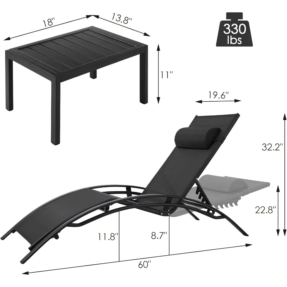 - All-in-one outdoor set includes 2 loungers and a side table; each lounger measures 60" x 23.6" x 32.2" with a 18" x 13.8" x 11" table for your drinks and essentials.