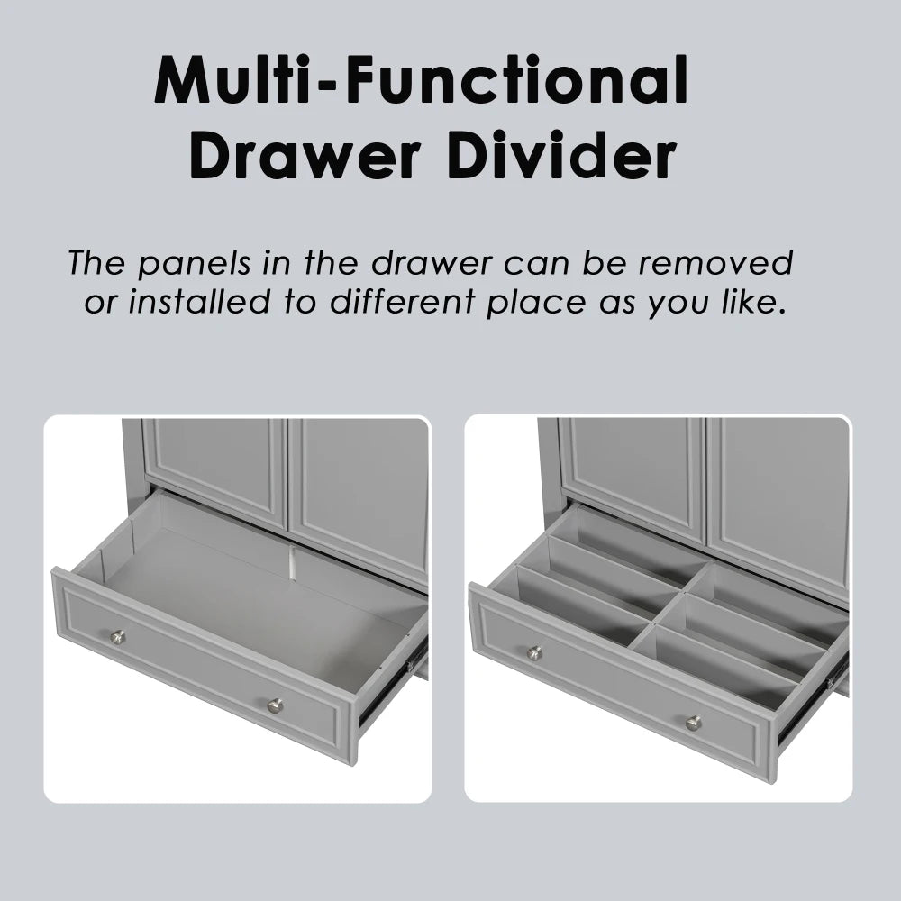 - Flexible storage: Two doors reveal a two-tier inner rack; a removable panel inside the large lower drawer and an adjustable shelf offer customizable organization.