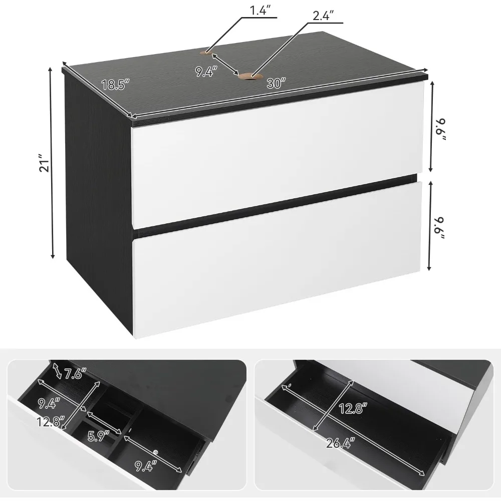 - Designed for your compact bathroom, this floating, wall-mounted vanity with an 18.5'' D x 30'' W x 21'' H footprint creates the illusion of space, keeps floors clear, and makes cleaning below easier for you with its timeless black-and-white finish.