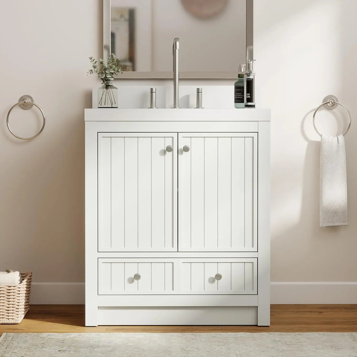 - You can rely on durable, water-resistant zinc alloy hardware and a scratch- and stain-resistant quartz countertop that cleans easily, with a moisture-resistant finish for longevity.