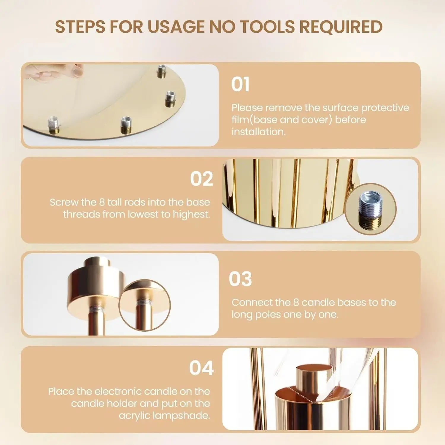 - Golden bases and arms with transparent acrylic shades create a warm, romantic atmosphere that complements any room or event, from weddings to upscale dinners.