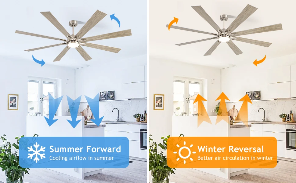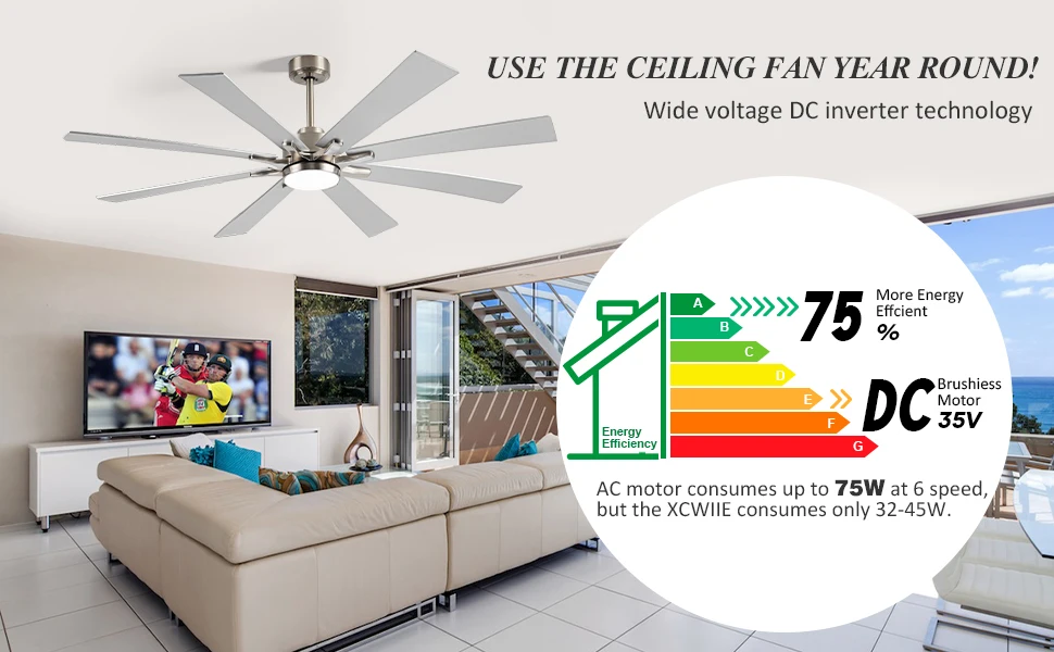 - Eight dual-finish plywood blades deliver balanced airflow from a powerful, energy-saving DC motor with up to 75% less energy use than traditional fans.