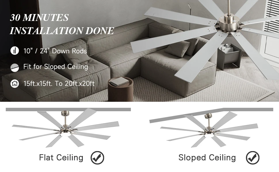 - Flexible installation—includes 10-inch and 24-inch downrods for flat or sloped ceilings up to 20 degrees; damp-rated for versatile indoor spaces.