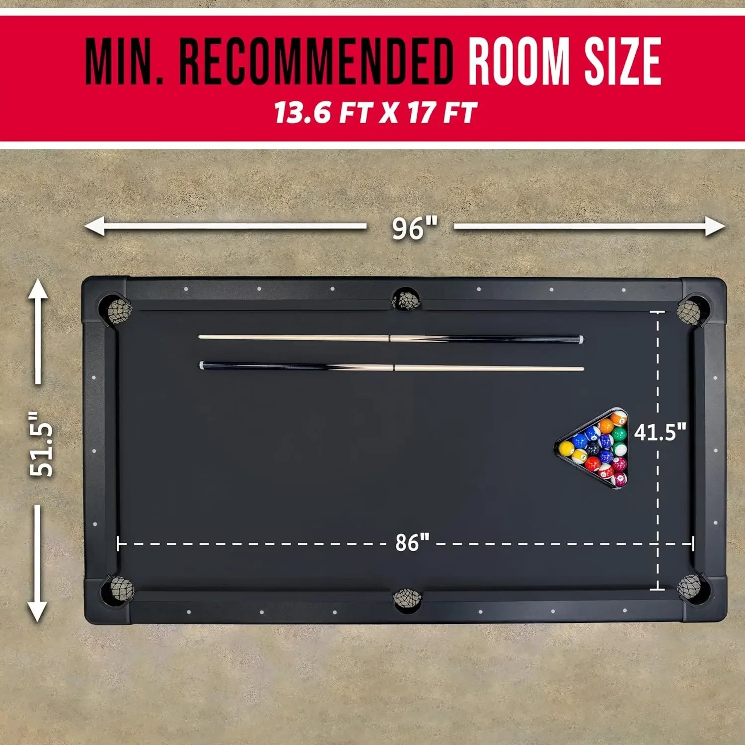 - Portable and space-friendly: at 96" L x 51.5" W x 31.5" H with a foldable design, it fits in most rooms; a minimum recommended area is 13.6 ft x 17 ft, and shorter cues help in tighter spaces.