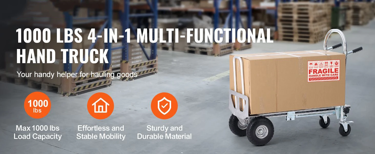 Move heavy loads with confidence using a rugged 4-in-1 aluminum folding hand truck that handles up to 1,000 pounds.
