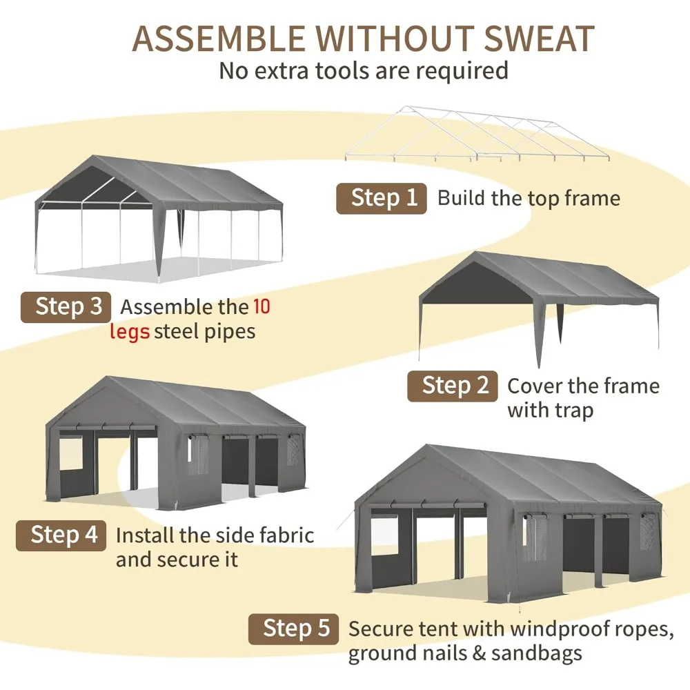 - Effortless Access: Front and rear doors, 4 roll-up side doors, 1 front door, and 4 windows for easy entry, airflow, and insect protection, ideal for workshops, equipment storage, or as a party tent.