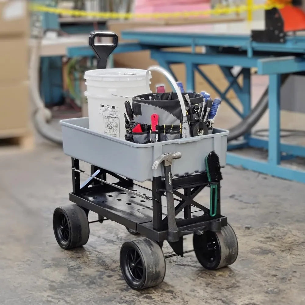 - EASY STORAGE + INCLUDED ACCESSORIES: Collapses in seconds for convenient trunk or garage storage; includes two removable end walls, one tool rack, one Poly Tub, two bungee cords, and four Never-Flat wheels.