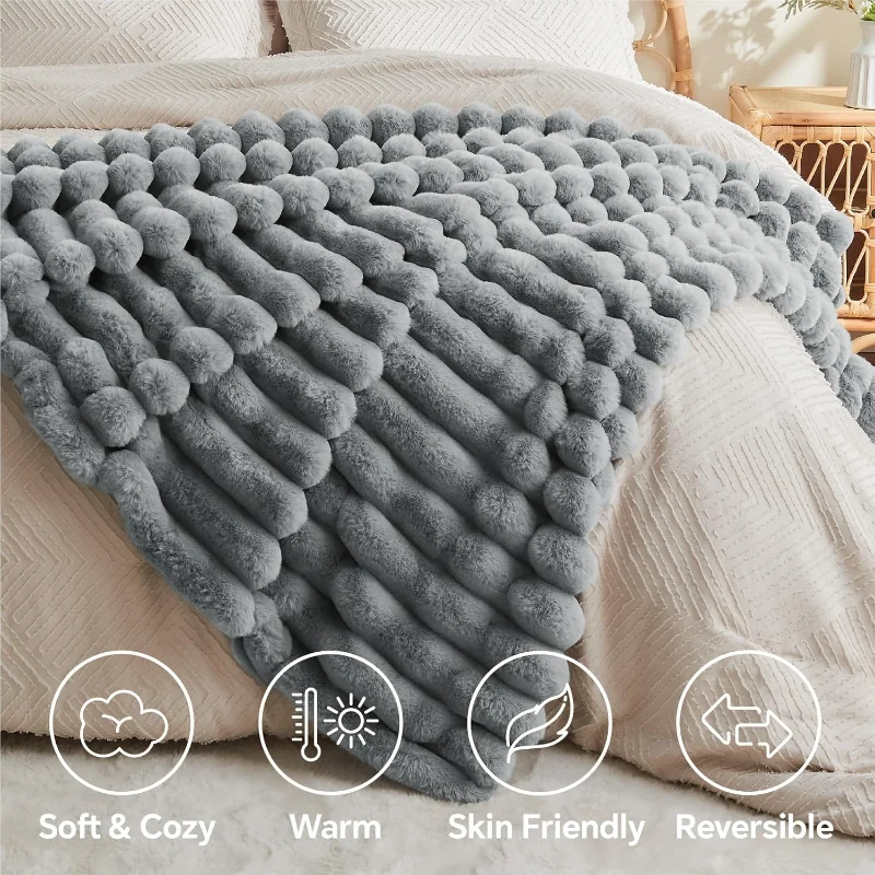 Indulge in cloud-soft warmth with this ultra-soft faux fur throw blanket featuring a 3D striped texture.