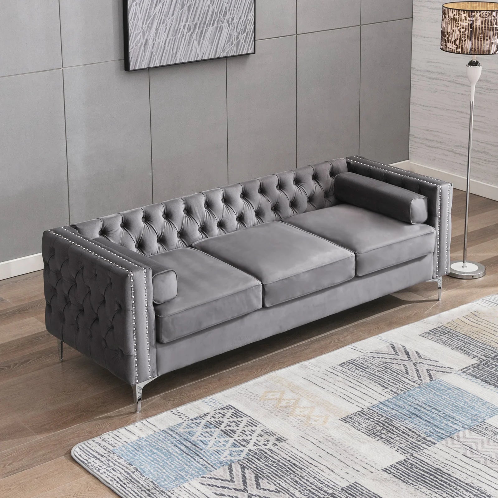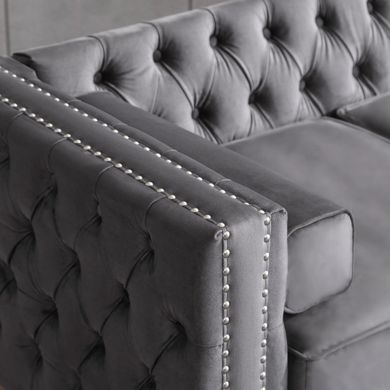 - Slip into a velvet surface with rich button tufting and sleek rivet accents that add a modern, deluxe vibe to your living room decor, while the fabric stays soft to the touch.