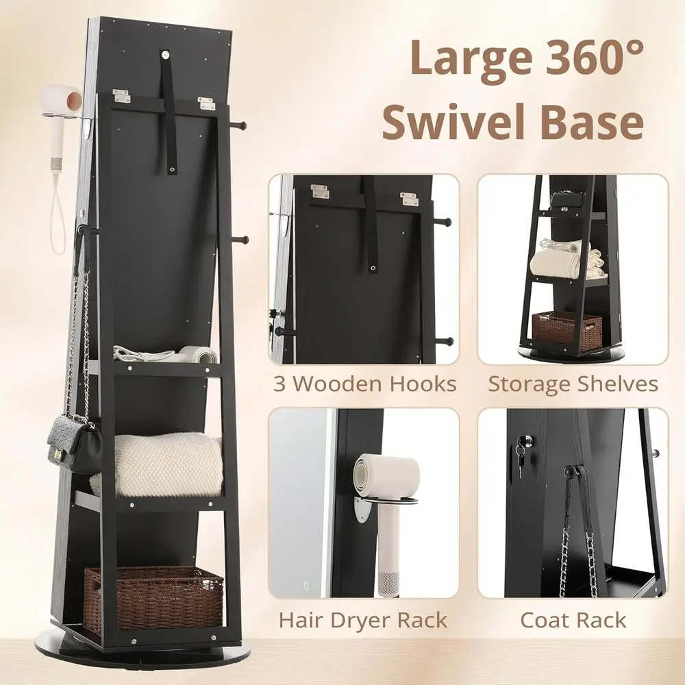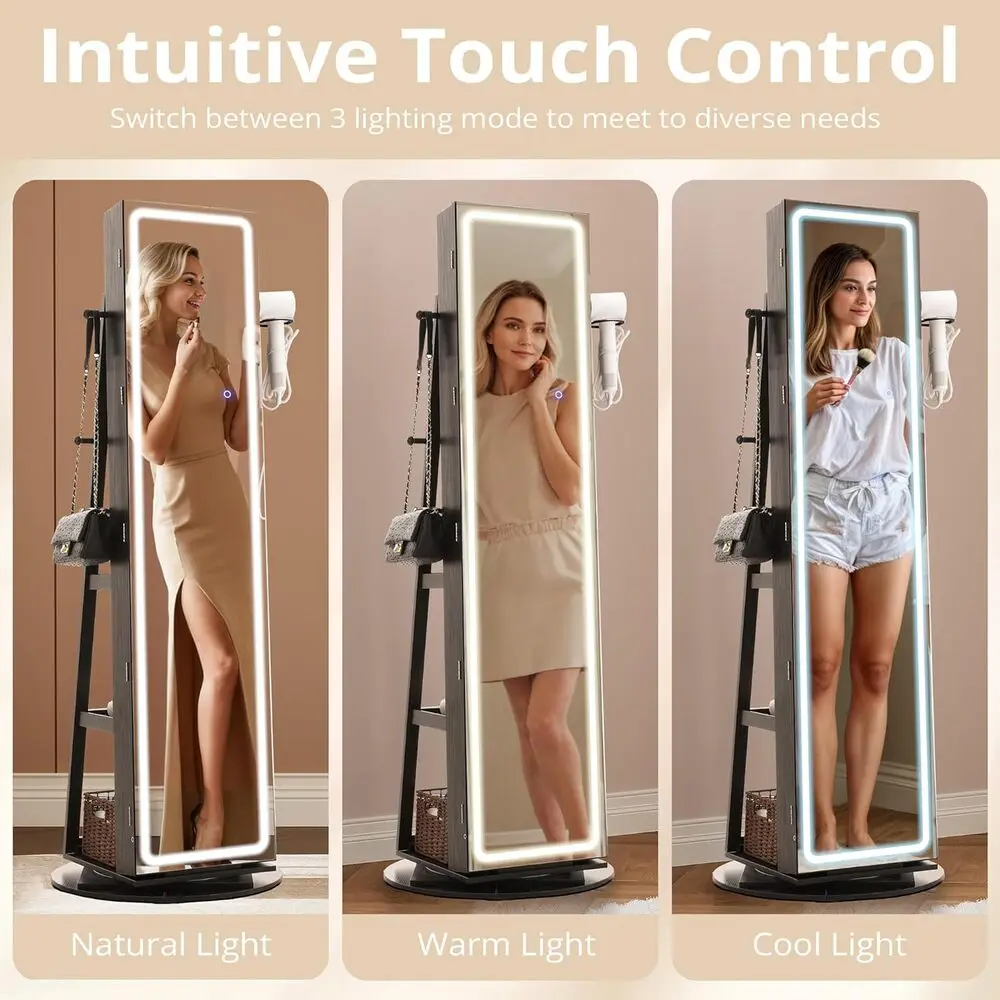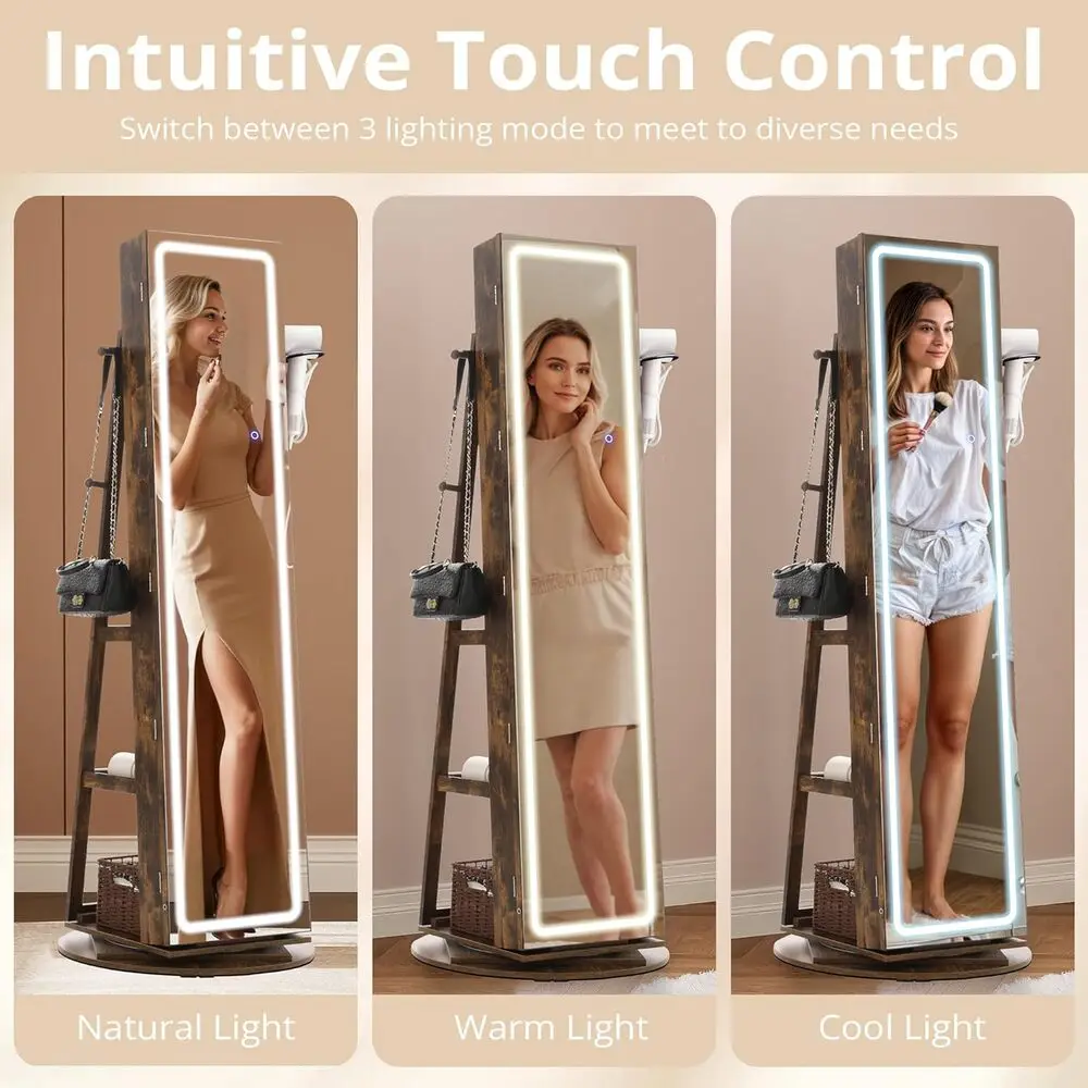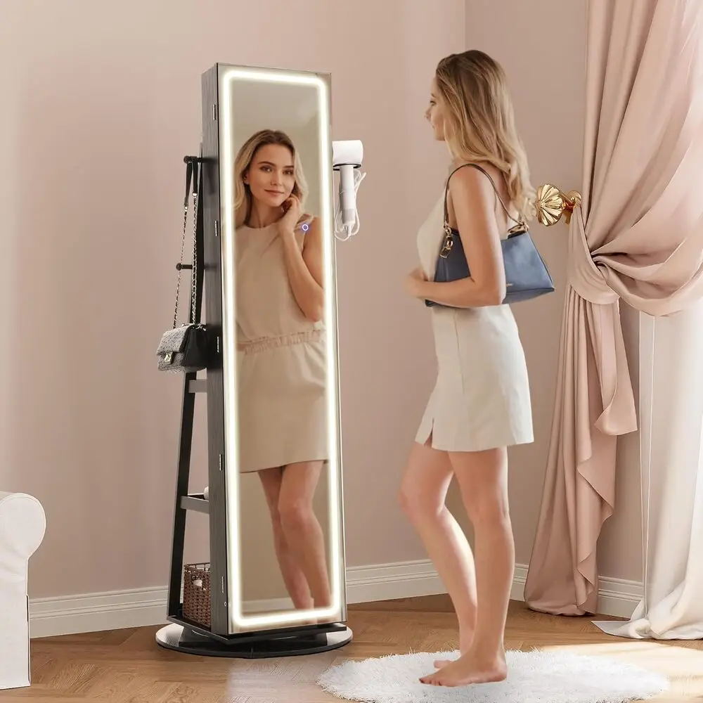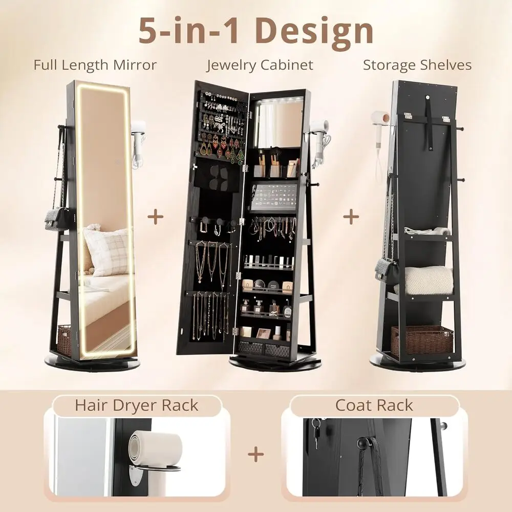 - You get a 5-in-1 design that combines a mirrored jewelry organizer, LED full-length mirror, storage shelf, hair dryer rack, and coat rack in one compact unit.