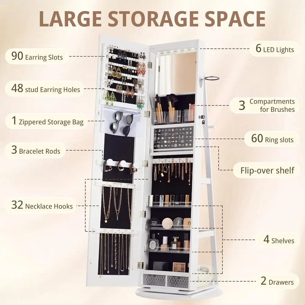 - You benefit from a 360° swivel base with lockable stability: sturdy MDF construction, velvet-lined interior to protect jewelry, and two keys for security; quick assembly.