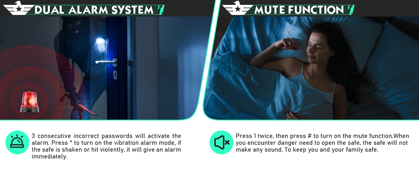 - Advanced alarms and mute option guard your property: triple-password attempts trigger a 30-second alert, vibration detection, and a 70 dB siren you can silence when needed.