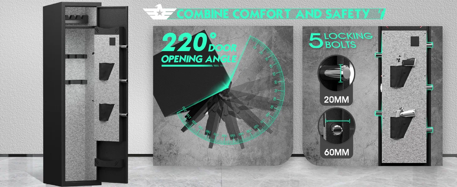 - Designed to fit up to five rifles up to 54 inches, it includes a soft foam rack, carpeted floor, and a 220° door for easy access.