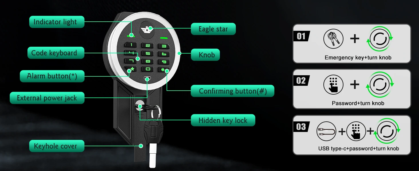 - Fast, error-free entry with 3D glowing digital buttons and memory for two codes, so you can unlock confidently even during power loss.