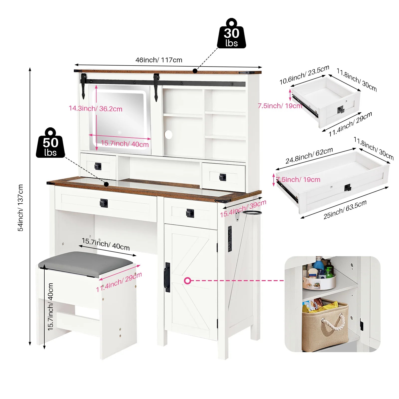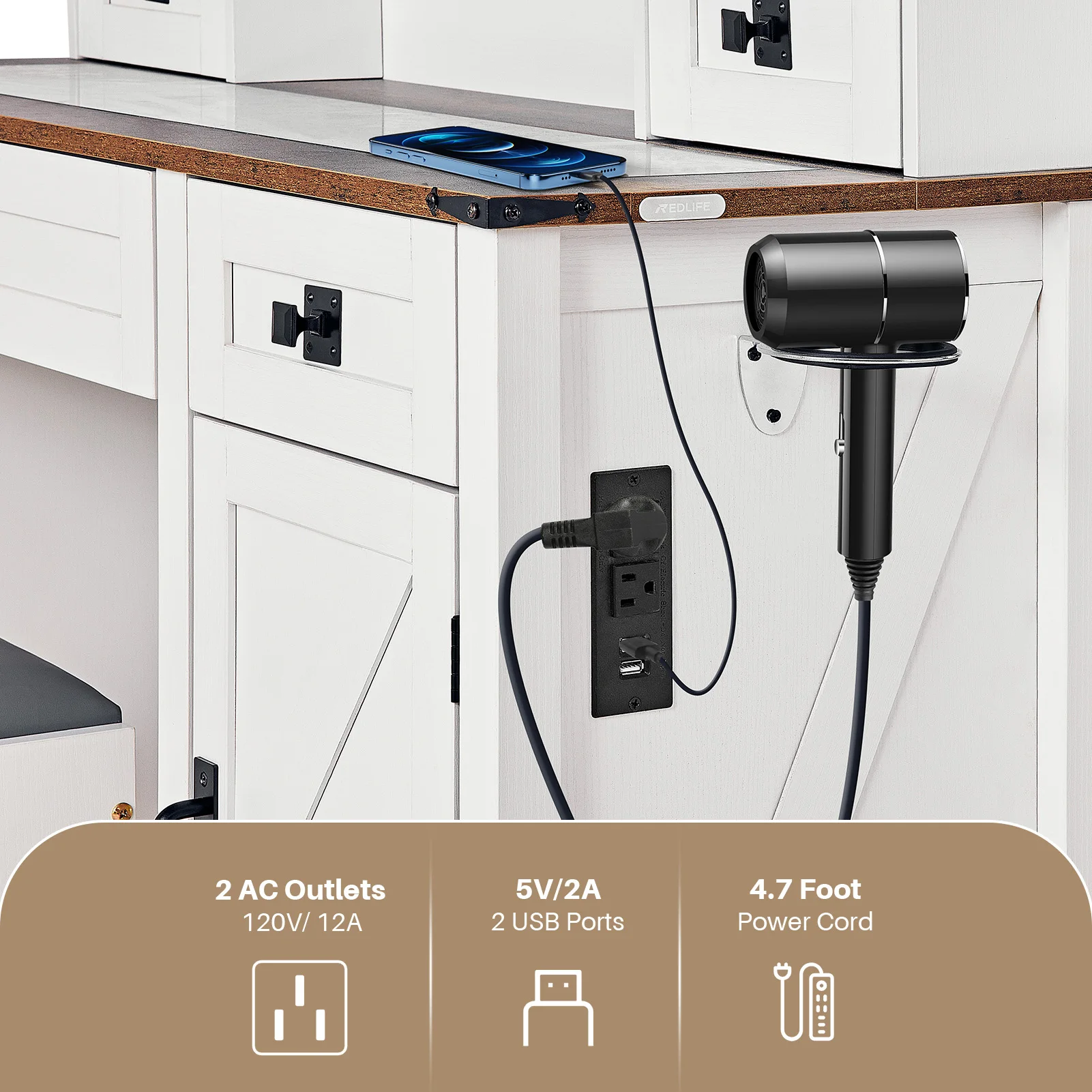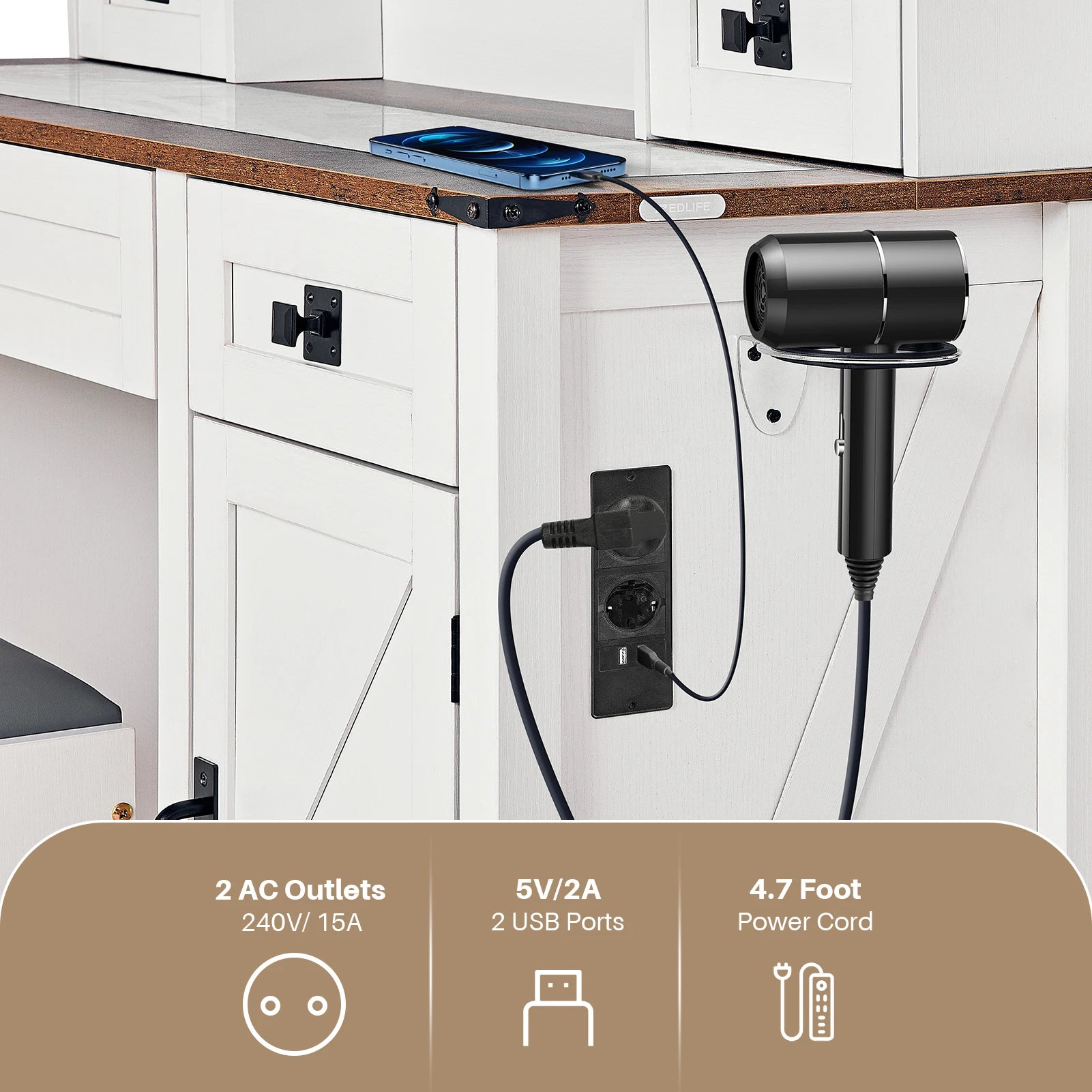 - Comfort & convenience: includes an upholstered vanity stool with hidden storage and a built-in hair dryer holder for quick styling.