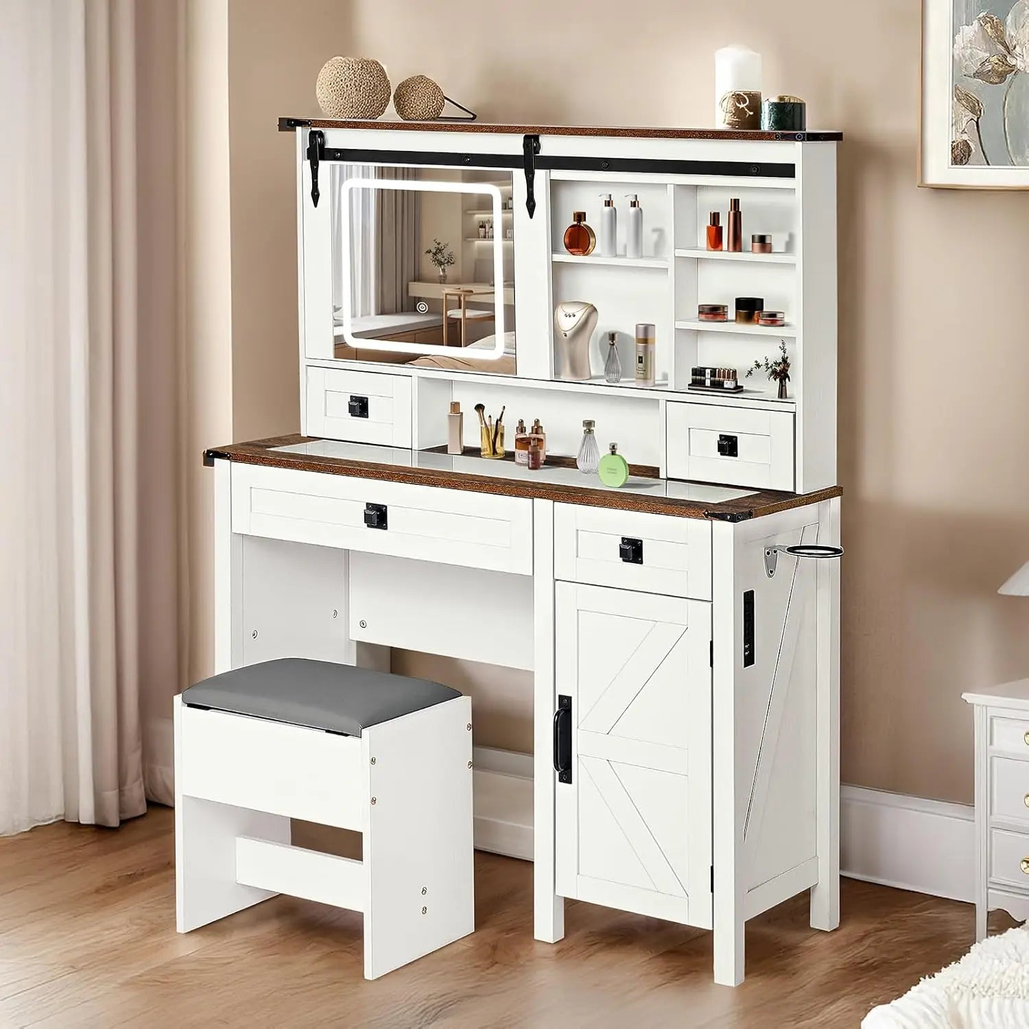 Transform your daily routine with a countryside-chic farmhouse vanity desk that elevates your makeup space with style and smart design.