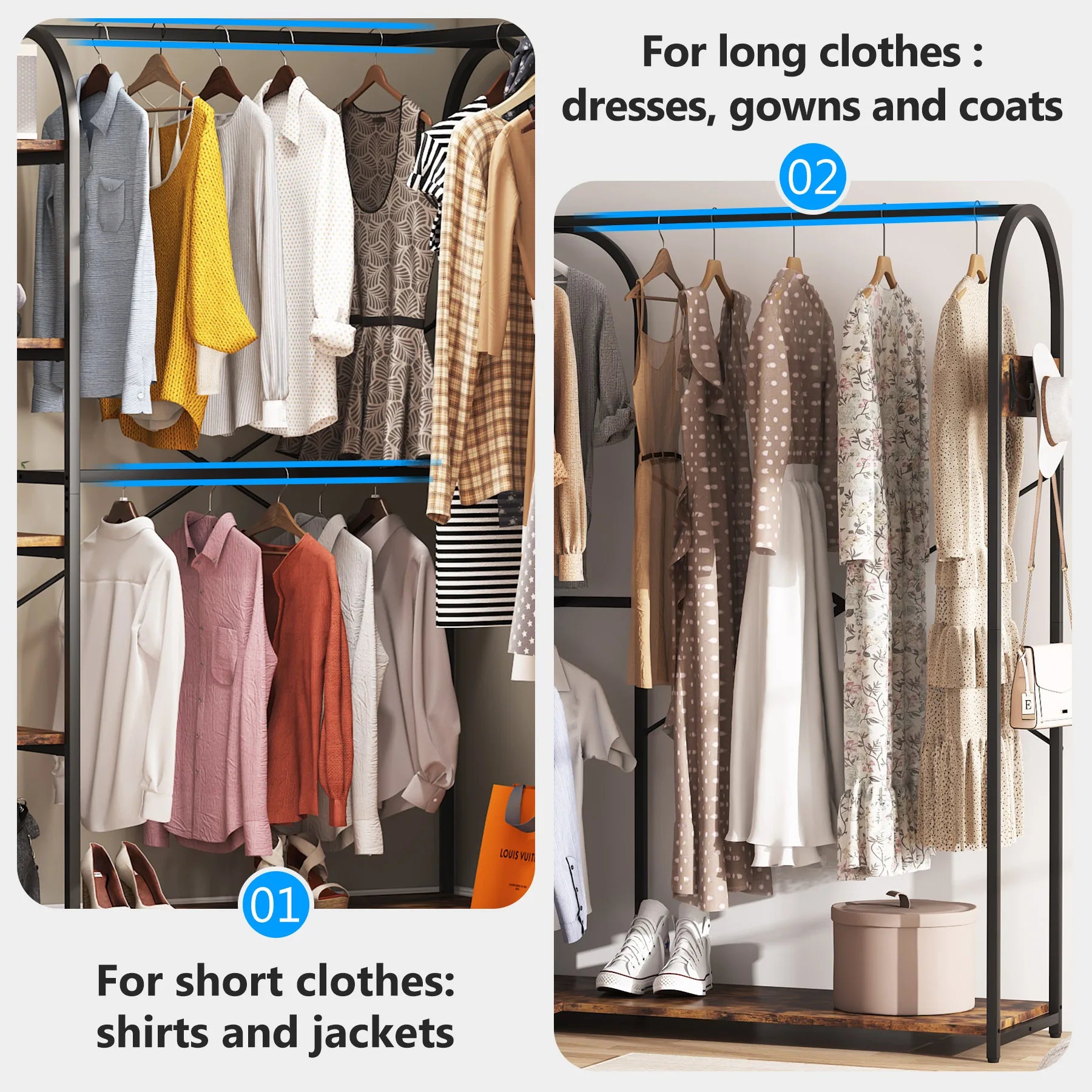 - Three durable garment rods plus five sides and two large shelves offer ample storage for outfits, footwear, bags, and seasonal gear.