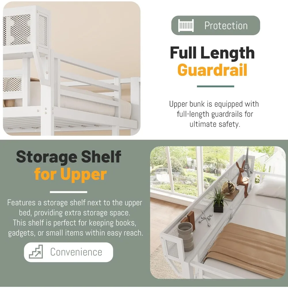 - A handy upper-bed shelf provides quick-access storage for books, gadgets, and decor, while mesh surround helps keep items secure.