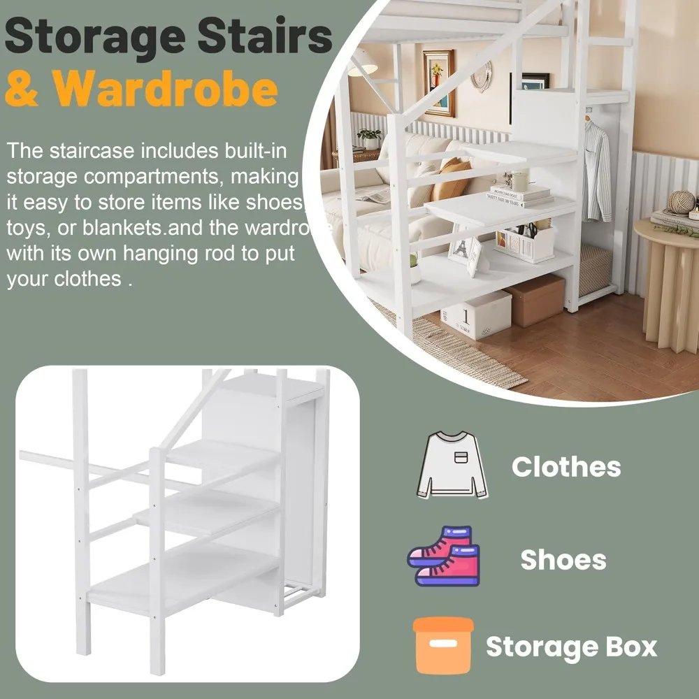 MKDK Metal Loft Bed With Stairs And Storage Wardrobe